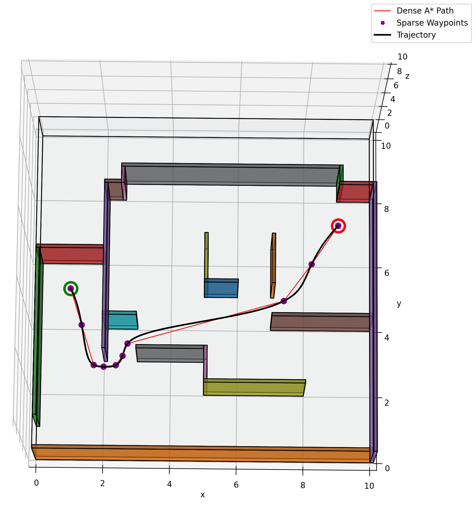 The objective of this project was to write a path planner, trajectory generator and controller to fly a quadrotor through different maps with obstacles and tight passages. In this project, my quadrotor flew the fastest overall time across a series of different map layouts. To achieve this time, I used searched for a potential path using visibility graphs and used a minimum jerk trajectory. Due to COVID-19 and restricted lab access, the implementation was tested in simulation only but should be runnable on the Bitcraze Crazyflie.